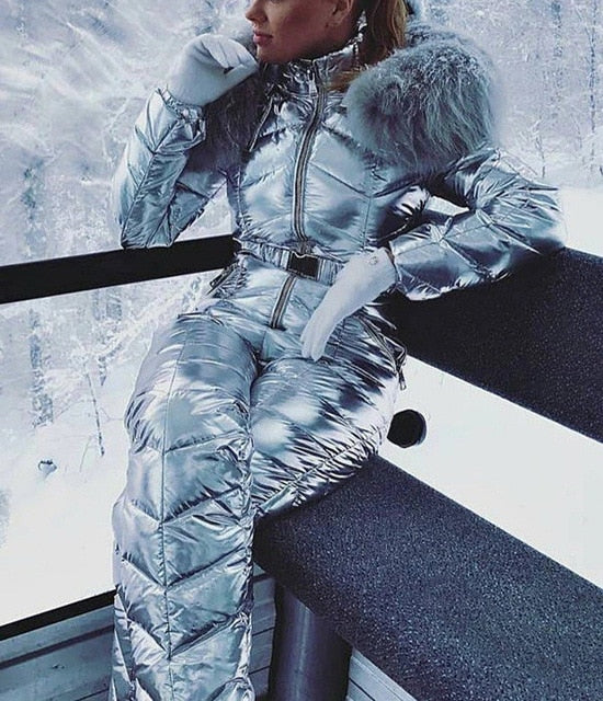 New Shiny Silver Gold One-Piece Ski Suit Women Waterproof Windproof Skiing Jumpsuit Snowboarding Suit Female Snow Costumes